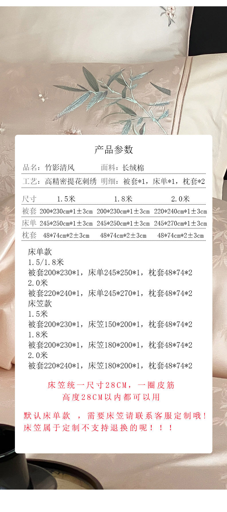 新中式全棉长绒棉床笠四件套精致竹子提花刺绣被套床品香槟粉灰色